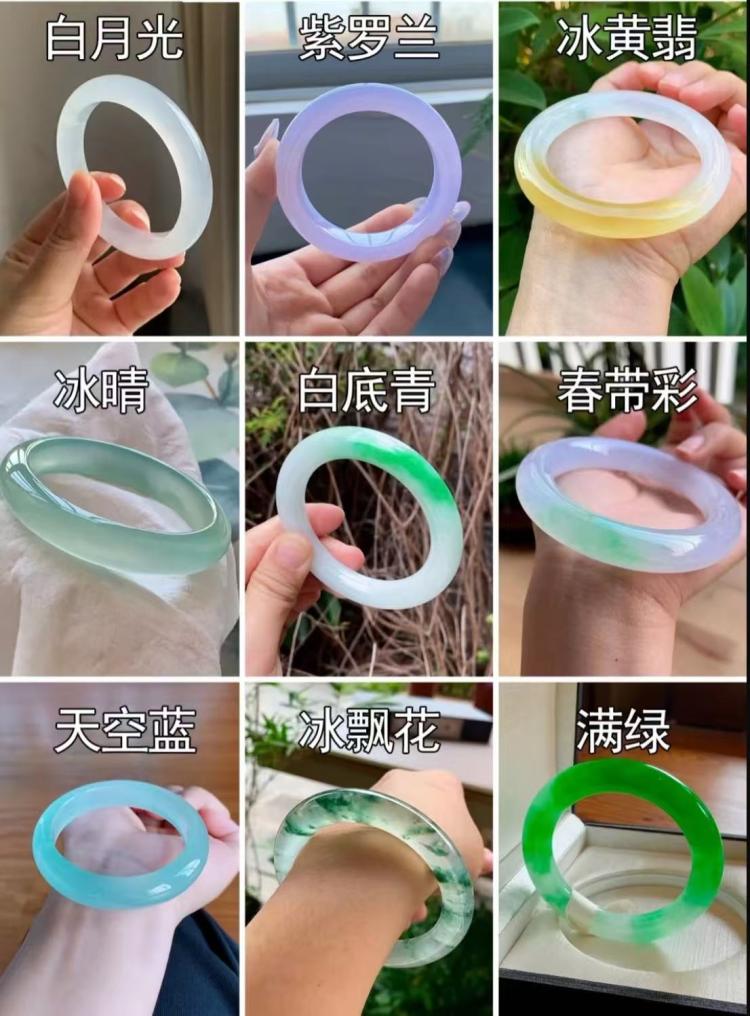 讲完翡翠的种水,再给大家介绍下,常见的翡翠颜色,看下方图片,这是市面上比较多的手镯,其中满色的翡翠手镯,价值是最高的,因为翡翠最出名的颜色,是绿色,也是最稀有的,一条满色的手镯,在市面上的价格,都是不低于七位数的,所以说,好的翡翠,价格都是不便宜的。